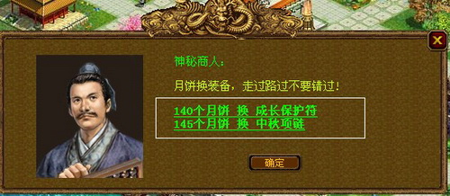 玩家们可以到“开封-百年老店”的“神秘商人”便可换取“节日装备-中秋项链”。其中还有十分珍贵的“成长保护符”可供兑换哦!