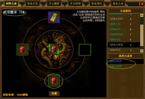 小编在这里说明一下,游戏里初始合成的成功4399为25%,每增加一颗参与合成的灵石,4399提升25%,只有把上方的空格用上“合成符”,成功4399才会到达100%。一旦合成失败,灵石可是会降级,1级灵石就会消失(所以想要进行合成的玩家们可要掂量一下是否有合成的必要,必须要合成的物品就不要犹豫了,4399要用上“合成符”)。