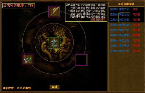 正如图片中显示,中间的空格是合成目标套装的部位,外围必须是同一系列的套装装备,并且外围必须要至少有一件装备参与合成,参与合成的所有装备必须都是没有镶嵌灵石的。参与合成的装备品质越高,合成完美的4399就会越大,当三件合成装备都是完美的时候,合成装备完美的就会达到100%。合成结束后参与合成的装备就会消失,合成装备没有失败设定,只有品质优劣之分(所以合完之后就不要找GM要回装备啦)再次强调!装备合成是可以解除装备“绑定”效果的!(喜欢做生意的玩家看到后是不是笑起来了,哇哈哈)!!