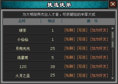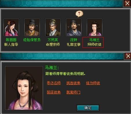 师徒系统在每个国家的主城新手村里设置,玩家进入新手村之后礼部主事将第一个接待,马湘兰是师徒系统的主管者,在这里可以寻访名师,挑选徒弟,正式结为师徒,如果师徒关系破裂,还可以在这里解除师徒关系。