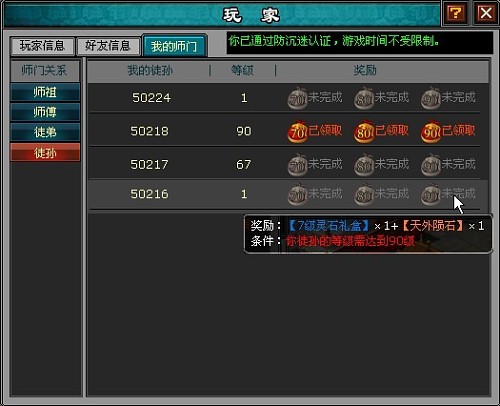 拜师后本人到达4399等级可获得丰富奖励;当徒弟或徒孙达到指定等级师傅也可获得奖励丰富奖励。奖励都在『玩家』-“我的师门”界面领取,奖励物品均绑定。师徒系统奖品发放规则为徒弟升级,师父和祖师都可以获得【7级灵石礼盒】、【天外陨石】、【5级灵石礼盒】、【孙子兵法四】等等多种奖励。