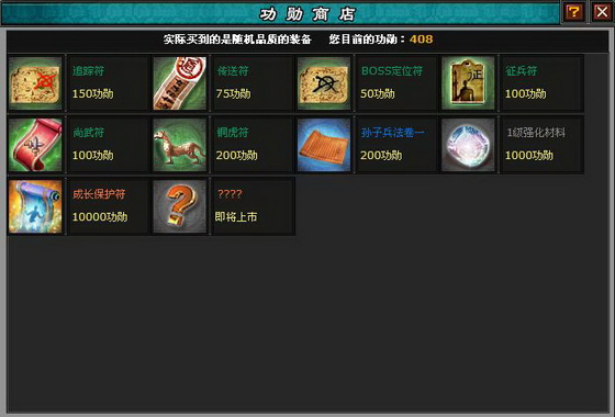 最多稀世珍宝的兑换商店是功勋商店。因为功勋相当难得,4399《明朝时代》各个服务器4399时间段后(大概是一小时)会有BOSS出现,全服务器的玩家都可以参加围攻BOSS来获得功勋。打赢不同等级的BOSS获得的功勋不一样,功勋商店中拥有价值80元宝的一级强化石,价值几百元宝的成长保护符,价值连城的传送符,BOSS定位符,追踪符,征兵符,孙子兵法一等等。