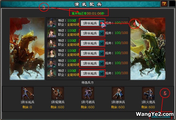 参加4399明朝时代演武比赛的玩家可以在规定的时间内报名,报名配对成功后,玩家需要在限定时间内给将领配好兵或给将领使用增益符,当挑战结束后,胜利的一方将获得对方的报名费。进入等待配对时间,如想换另一个演武场,可点击“取消报名”,配对成功后,可在将领的右边点击下拉框选择兵种,完成配兵,点击“确定”按钮,等待对手确定,对手确定或倒计时结束后,进入战斗界面。