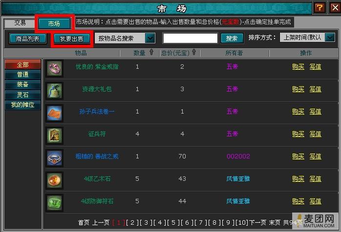 点击进去后,玩家就来到了交易系统。在系统中,有交易和市场两个方面,玩家点击【交易】就可以通过填写交易人和主题来发布交易信息。现在重点来介绍【市场】这一模块,在页面的右下方就是其他玩家确定交易出来的装备道具。可以买也可以卖,这里面有一个小窍门,那就是在这里买装备道具,可能会比在商店里买便宜哦,同时有些装备道具是商店里买不到的。