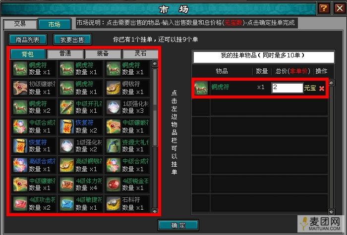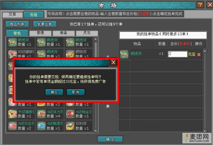 出售商品是需要交税的,这在现实中如此,在4399《明朝时代》里也一样。挂单需要交1银的税。挂单栏里同时最多可以挂10种商品道具。每次挂单时间最多为7天,逾期未成交挂单将自动过期。所以如果玩家真的向出售装备道具,那就要定一个能吸引其他玩家的价格了。