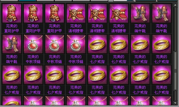 节日套装是明朝时代中属性最高的兵器之一,也是最炫眼和唯美的装备,不同的组件代表着不同的含义。七夕刀、重阳甲、端午靴、春节头盔、元宵护肩、清明腰带等等是男人们的最爱,让无数的英雄愿意为它们竞折腰。