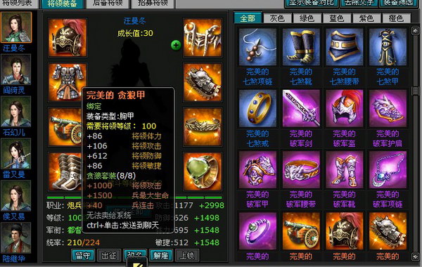 贪狼,杀破狼之首,大名如雷贯耳,每个明友都知道它是一个无敌的存在。可惜它对很多人来说就如登月服一样只是遥远的传说,只闻其名而难以见其面。但是每个人都忍不住对它的遐想,特别是随着其在战场上越来越多的现身,证明只要努力还是可以拥有的,我也是明朝时代的玩家。可通过贪狼碎片合成,套装要求100级,橙色套装效果,完美基础属性加1000将领攻击,40兵的连击和1500兵生命。所以传闻得贪狼者得天下!是众多明友们一生的梦想追求。
