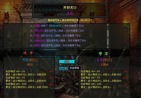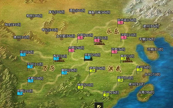 永乐争雄,旗帜插得只剩洪、万两国的主城了。明朝时代第二新区永乐国在国王和大将军两人的带领下发动起了全新的国战攻势。永乐近期国战攻破了成都,占领万历仅剩的两个城市之一。此战役中,万历为了复国,在凉州,兰州,昆明和成都四成同时发动反击,而洪武国则集中力量在广州发起总攻,志在夺回富裕的广州城。两个国家希望联合起来共同保证自己的生存,不过从整体形势上看,早大势已去,永乐早已志在必得。