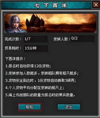 族长或副族长租好船后,族人即可到郑和处免费报名参加。当报名参加的人数达到4个以上,宗族族长或副族长即可以宣布开始启航行了。起航时参与航行的每人免费获得12货物,航行成功到岸后,船上的每件货物按5银两兑换。如果在航海的15分钟船只没被击沉,顺利到达对岸,则算完成下西洋任务。
