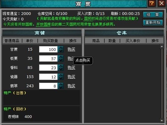 玩家在参加商贸是,每次最多只能买入100件,仓库空间与买入的数量有关,购买商品的数量受现有通宝以及仓库的限制。而且同一商铺在价格刷新前只能购买一次,在一个商铺购买一次商品后可以到其他城市商铺继续进行购买,或等待价格刷新。 由于国家资金有限,每人每天的启动资金“通宝”会根据之前一天参与商贸活动的人数进行调整。每次卖出商品赚取的差价都会算进“今天贡献”,差价小于0则今天贡献增加0。