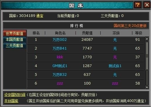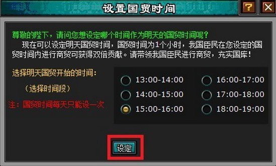 参加商贸还有一个重要的就是在国贸,在国贸时间进行商贸任务可以获得双倍贡献,为国贡献最多的人可获得丰厚奖励,可谓名利双收。在由国王设定的国家商贸时间内进行商贸活动可获得双倍贡献值,而且可以免费发送商品信息到聊天频道,让整个国民共享。不过需要注意的是国家商贸时间需要提前一天设定,所以想要获得钱财和荣誉的国民可别忘记提醒国王和皇帝,开启国贸啊!