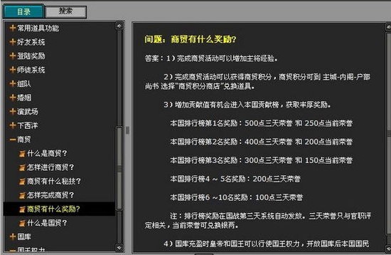 所谓商贸,就是在各城市间通过低买高卖赚取差价的活动,这就要求你要有敏锐的市场嗅觉和丰富的信息资信。玩家到30级后就能参与商贸任务。每天商贸时间:8:00 ~ 19:40。商贸时间内,在主城的新手村或其他城市的默认出生点可以找到NPC-商贩进行商品买卖。参加商贸活动可以充实国库,当国库充盈时,皇帝或国王执行“开放国库”让国民用荣誉兑换银两!