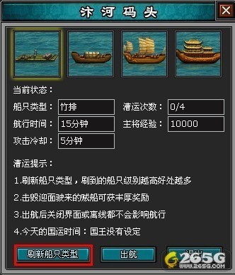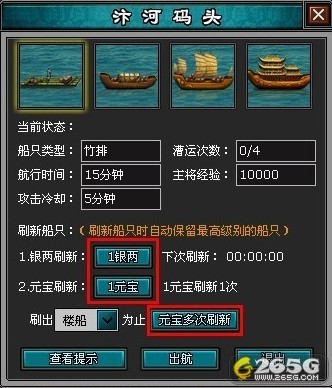 漕运有竹排、木船、帆船、楼船四种船只可以使用,船只等级越高,奖励就越丰厚,打击水寇也越便捷。而在参加漕运时系统默认的船只是竹排,在刷新后4399更高级别的船只。刷新船只种类分别有“银两刷新”、“元宝刷新”和“多次刷新”。每隔两小时可以用银两刷新一次船只种类,每次刷新仅需1银两。元宝刷新则随时可以用且没有次数限制,每次刷新仅需1元宝。元宝多次刷新,也就是可以选择刷到某种船只类型为止,每次刷新需要1元宝,刷新到指定等级或元宝耗尽时停止。不管用哪种方式,刷新船只时都会自动保留最高级别的船只,船只类型不会往回掉。