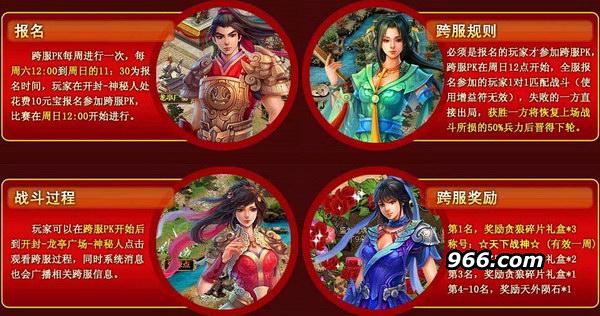 跨服PK每周进行一次,每周六12:00到周日的11:30为报名时间,玩家在开封-神秘人处花费10元宝报名参加跨服PK,比赛在周日12:00开始进行。参与跨服战斗的将领必须遵守大决战的一下规定:必须是报名的玩家才参加跨服PK,跨服PK在周日12点开始,全服报名参加的玩家1对1匹配战斗(使用增益符无效),失败的一方直接出局,获胜一方的恢复上场战斗所损的50%兵力后进入下轮。