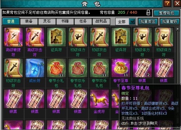 亲友们,开春的那一天,市场又上一批新礼包,就是已经广为大家所知的新春系列礼包,这个系列的礼包专为打造节日装备而诞生的,大家都拿出开春之前就已经拿到的除夕刀吧,将这把神赐高品质武器打造成天下无敌的法宝。新春系列礼包中的物品如下:春节小礼包:打开可获得:中级合成符x9、中级开孔符x1、中级镶嵌符x1、1朵玫瑰花x1原价36元宝只卖27元宝。春节欢乐礼包:打开可获得:3级迅雷符石x9、中级开孔符x1、中级镶嵌符x1、1朵玫瑰花x1原价36元宝只卖27元宝。春节至尊礼包:打开可获得:高级镶嵌符x5、高级开孔符x5、高级合成符x5、9朵玫瑰花x3、1级强化材料x3原价330元宝只卖238元宝。