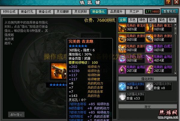 当然,品质是相当难搞的,积少成多,大量收购是解决品质问题的办法,需要多一些时间。最后一项打造则是强化。很多小盆友一拿到高品质装备就猴急的强化,还傻傻的炫耀,青龙套就要谨慎一些,你想要完美的青龙套装效果就得把强化放在最后一步。因为镶嵌和提升品质后增加的属性也会有效的影响到强化的属性。