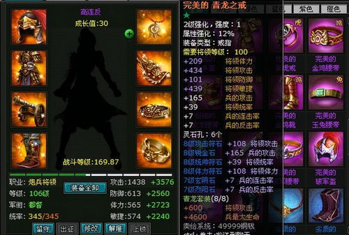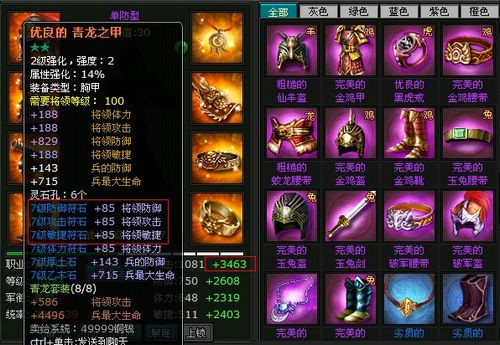 元老推荐强攻型镶嵌配方:8枚攻击符石+8枚体力符石+8枚迅雷石+8枚锐金石。想打造强攻型将领,装备方面这三者缺一不可。攻击和锐金会大范围的增加将领的攻击力,体力石头是暴击的依据,将领的体力越高,暴击率就越大。而更不可忽视的是迅雷,强攻型将领如果缺少迅雷,在战斗中攻击的次序落后于敌人,很容易被秒。