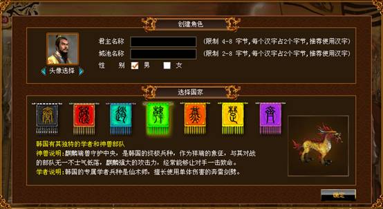 在该页面中,玩家必须输入君主名称,支持4-8个字节的英文、中文、数字;城池名称,2-8个字节的英文、中文、数字。每个中文字符占用两个字节,推荐使用中文。性别的选择主要影响角色的头像以及游戏中一些特殊装备的取得。