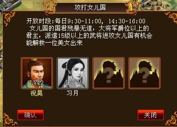 当你打开墨攻的城外地图,会发现一处神秘之所——女儿国。女儿国的国王荒淫无道,众美女正处于水深火热之中。女儿国每天限时开放,玩家只要到达大将军爵位后就可以派遣15级以上的武将攻打女儿国,每攻打一次都有机会把一个美女救出苦海。攻打其他玩家有美女的城,只要攻城胜利也能获得4399数量的美女。