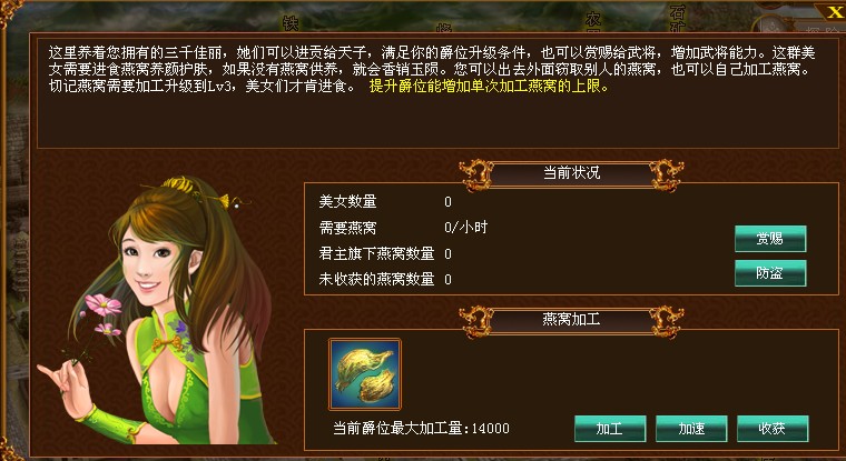 每位美女需要消耗10个燕窝/每小时,您可以出去外面窃取别人的燕窝,也可以自己加工燕窝。燕窝的加工时间是固定的,与加工数量无关,加工lv1为1小时,加工lv2为1小时,加工Lv3为6小时,燕窝需要加工升级到Lv3,美女们才肯进食。