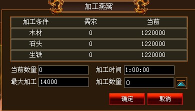 加工每个单位燕窝消耗石头,木材,生铁各10。