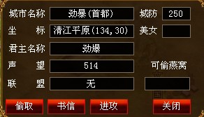 如果你自己懒得种燕窝或是美女太多养不过来,可以趁别人不备去把他未收获的LV3燕窝偷回来养自己的美女。在大地图上点击其他玩家的城池就能看到城内的美女与可偷燕窝数量,每次偷取300个。