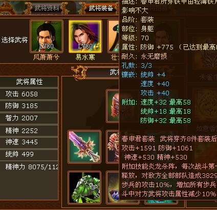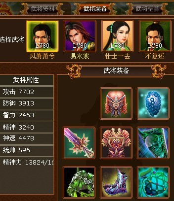 我对中国历史非常有兴趣,墨攻天下给了我从回古代的感觉,古色古香的游戏操作画面,英姿飒爽的武将。刚进去的时候,确实是有点闷,一直的升级建筑,一直的挂将**。武将到达60级就好玩了,可以刷塔和副本了。每次爆出紫金装备还是挺开心的,每天三次,刷刷更健康。偶尔晚上还可以去夜袭一下,收获也不少,总是拉着满载的资源回来,省去自己很多的时间,一开始,我加入了狂扫天下联盟,本来是排第三的联盟,盟里的人来了又走,走了又来。但总的来说还是很团结的,慢慢的就变成了十区第一盟。从那开始,我的声望和武将也一直排在第一。从来没有几个人敢来攻打我的,我也很少去攻打别人,都是靠开箱子来的资源,一到国战开得更凶。有很多玩家说不够玉石造神兽,我的玉石却多得用不完。当我第三个将80级的时候,我声望也到了400W,十区第一个始皇帝,第二名的人200W都还没到。当我第四将也80时,套装出来了。市场里的装备一下火了起来,我由于懒得刷塔,几乎合套装用的所有紫金都是靠市场购买的,再后来更郁闷了,有钱也买不到紫装,有的人要不是绑定了的,就是收着自己用,只好破掳了,破了几千块后,我的80套装也出来了,可惜没赶上感恩节的活动,要不可以白领几千元宝。国战奖励的宝石,加上破掳积累下来的孙中,我还差几个就满六级石头了。给大家看看满统帅是怎样的哈(附加全部是18统帅,满6级虎眼。)