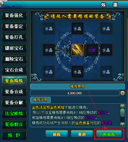 精炼八阶紫法宝可选择两种方式,放入八阶金色法宝后可在右下角选择切换: