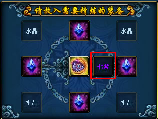 方式二: 需要放入8阶金色法宝(已鉴定且未经修炼强化镶嵌)+7阶紫色法宝(可经修炼强化镶嵌)+4个8级紫水晶。