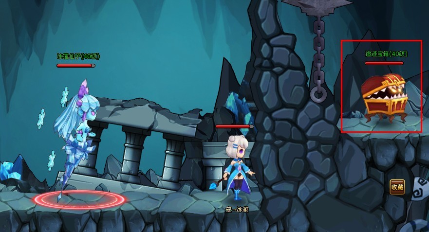 上图就是冰莲仙子的遗迹宝箱所在了。直接跳是跳不过去的,只有唯一的通道——高空铁索才能抵达遗迹宝箱。