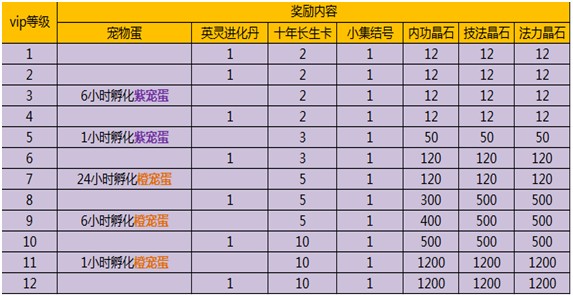 活动内容:Vip冲级,所向无敌!活动时间内,vip等级达到指定等级则可获得相应礼包奖励,礼包内含更多助您踏上强者的道具物品,机不可失失不再来哦!(一次性充值时,不管达到哪个等级的vip,该级别及前面几个级别的礼包都可以拿到哦)