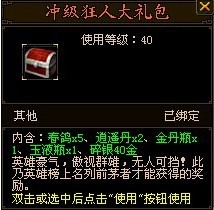 【活动内容】只要在活动期间内角色等级达到40级的玩家,均可在江陵(71,98)礼物仙子处领取冲级狂人大礼包。(这个奖励要求在活动时间内完成并且领取,过期作废)
