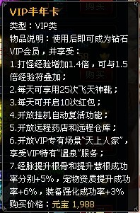 VIP可以享受到最特别的待遇,为了使你更显尊贵,玩家在成功开通VIP以后,角色的名字会变为醒目的特殊标识,角色面板并伴有被点亮的VIP图标提示。