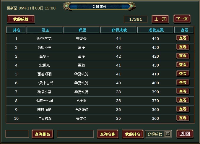 活动二.英雄成就荣耀殿堂(英雄成就排名榜前10名):