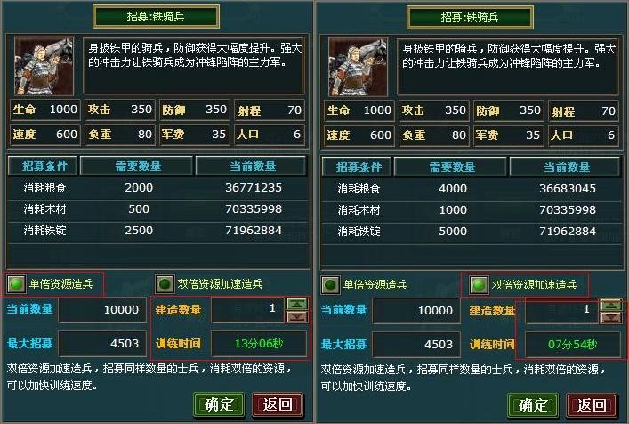 在进入军营之后,除游戏默认的正常的单倍资源造兵外,玩家也可以选择使用双倍资源来进行加速造兵。只需花费额外的资源消耗,玩家可以超大幅度的提升出兵速度。