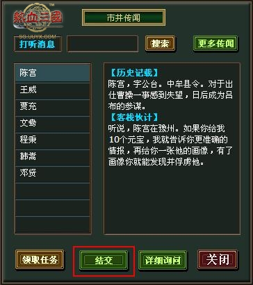 三国之中你最想与谁为友?名将之中,你一心的目标又是哪位?在客栈的“市井传闻”中找到自己心仪的名将后,花费4399黄金就可以与名将“结交”友好。