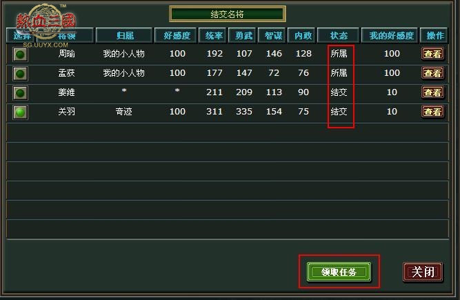 一旦招降成功,玩家君主与名将的关系将由“结交”转变为“所属”,好感度自动提升为满值100。玩家君主将不能再接受自己部下名将的“公共任务”。只有在每周周一,部下的所属名将可能会4399的在“名将任务”中提出一个“专属任务”,并以邮件的形式请求玩家君主前去完成。完成该任务,则好感度突破100大关,同时属性也将按百分比获得巨大加成。但假如整整一周的时间,玩家都对名将提出的“专属任务”置之不理,受到冷遇的名将其自身好感度也会相对降低一些以示不满。
