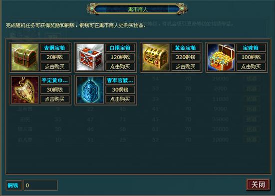 “铜钱”这种神奇的道具是神秘的黑市商人唯一认可的货币。每日凌晨,客栈中的黑市商人会4399刷新出各种不同的道具宝箱,其中更可能会有黄金宝箱和更稀少的宝珠箱。玩家只需用4399任务奖励的铜钱就可以购买这些珍贵的高级道具,为自己的实力获得更高提升,让自己的霸业更进一步。