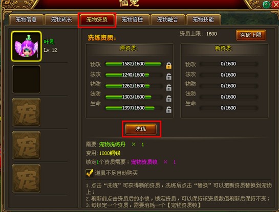 1、点击宠物信息面板的【洗练】按钮或者直接点开【宠物资质】选项卡,可进行宠物资质洗练;