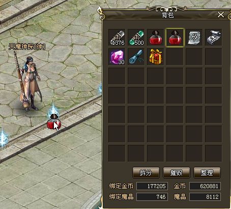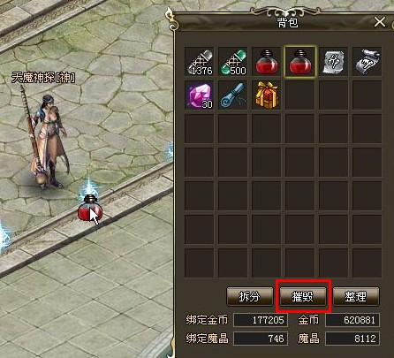 5、物品摧毁:在道具栏中左键选中物品后点击左键不放,拖动到游戏界面空白处松开鼠标左键即可摧毁(或者使用背包的摧毁功能)。弹出提示框后,点击确认即可。