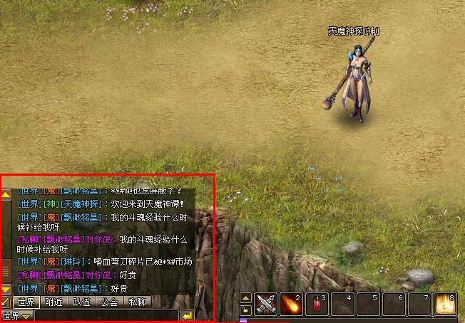 1、进入天魔神谭后,在画面的左下角就是“游戏聊天框”了,在聊天框里可以显示各个频道的玩家对话。