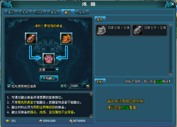 3、融合材料必须为同职业同等级段的装备。