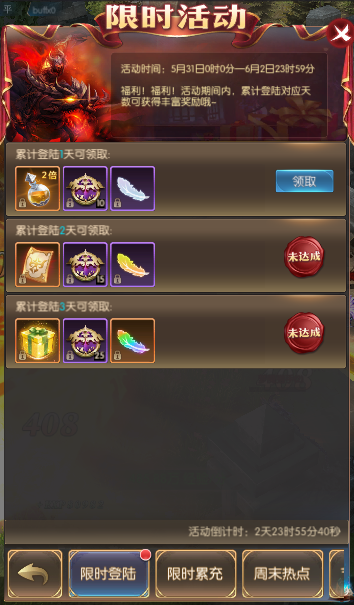 活动简介:福利!福利!活动期间内,累计登陆对应天数可获得丰富奖励哦~