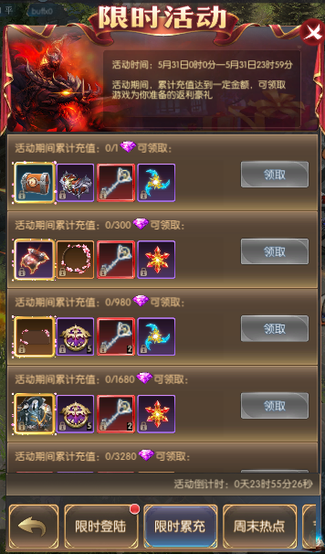 活动简介:活动期间,累计充值达到一定金额,可领取游戏为你准备的返利豪礼