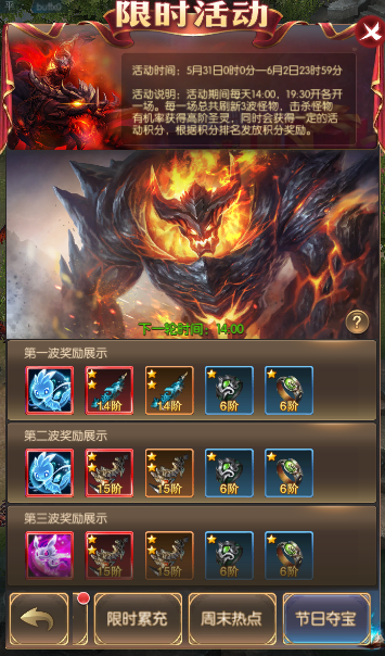 活动简介:活动期间每天14:00,19:30开各开一场。每一场总共刷新3波怪物,击杀怪物有获得高阶圣灵,同时会获得一定的活动积分,根据积分排名发放积分奖励。