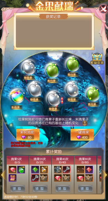 3.果子共分4个等级,1-青月果,2-银霜果,3-鎏金果,4-彩晶果,随等级提升获得稀有奖励的提升,彩晶果必然获得稀有奖励