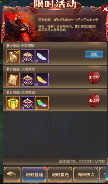 累计登陆3天 | 疲劳礼盒,热点*25,神圣之羽 |
