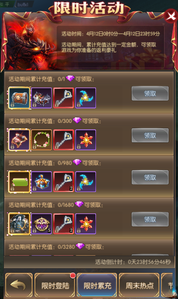活动简介:活动期间,累计充值达到一定金额,可领取游戏为你准备的返利豪礼