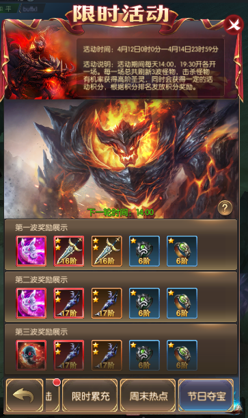 活动简介:活动期间每天14:00,19:30开各开一场。每一场总共刷新3波怪物,击杀怪物有获得高阶圣灵,同时会获得一定的活动积分,根据积分排名发放积分奖励。