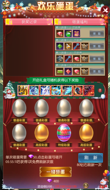 活动简介:活动期间,点击彩蛋即可砸开彩蛋,获得奖励;每次刷新有出现"普通彩蛋","高级彩蛋","特级彩蛋";砸蛋达到一定次数还能获得额外奖励。